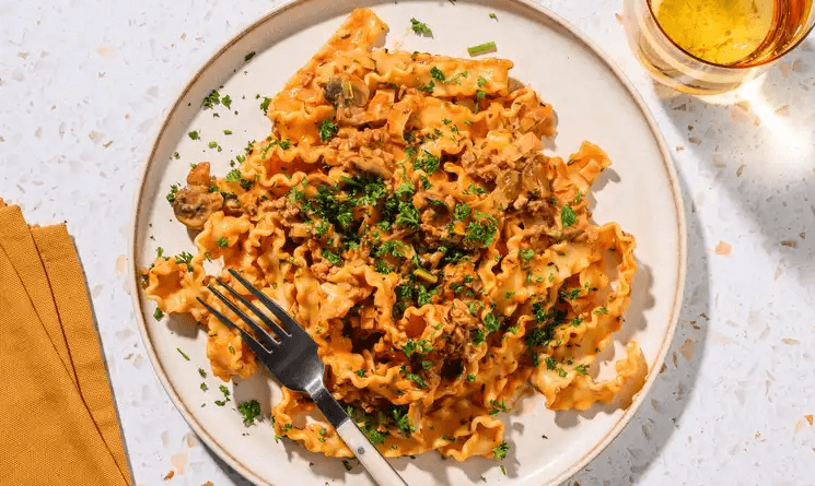 - Romige Stroganoff-stijl mafaldine met gemengd gehakt, groentemix en peterselie.